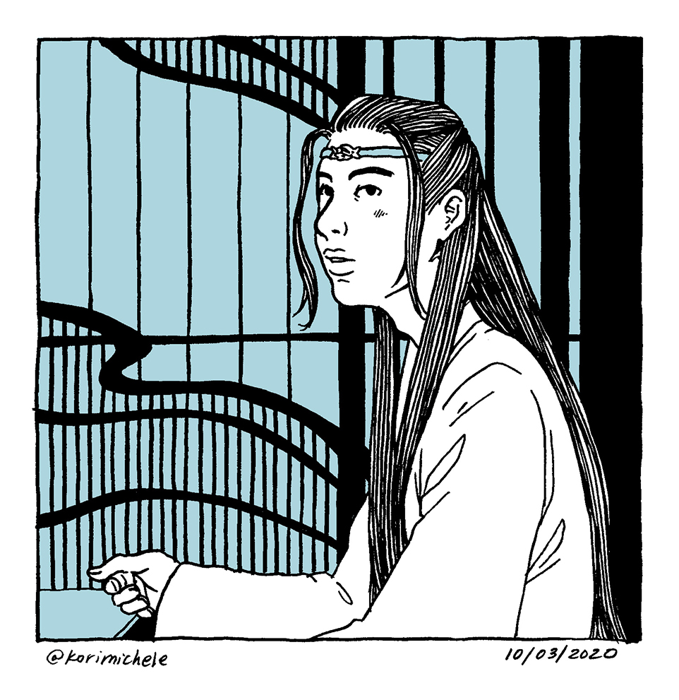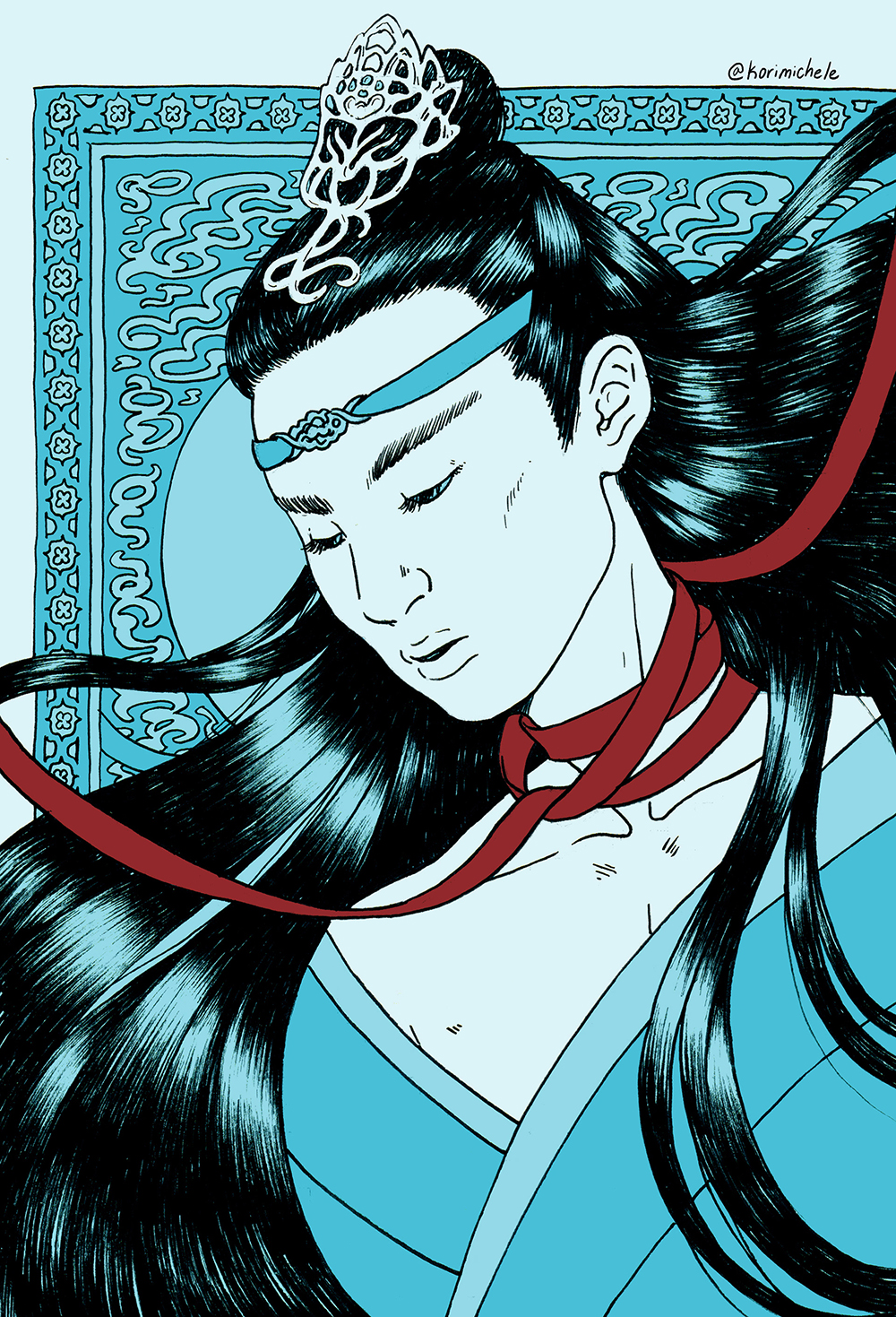 Untamed (Chinese Drama) fanart of Lan Wangji with Hair Down; ink on paper with digital color