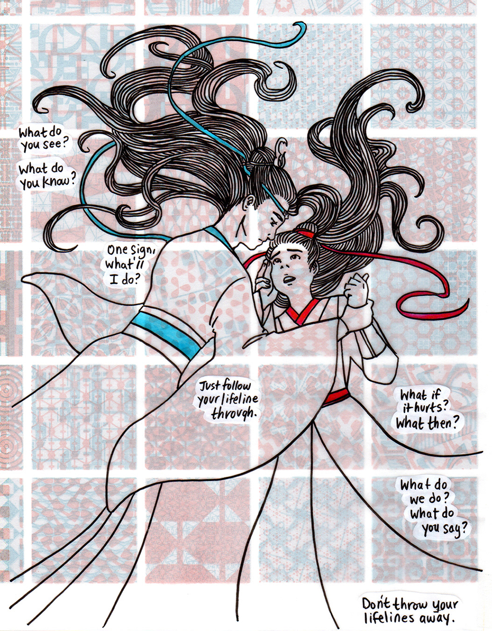 Untamed (Chinese Drama) fanart of Wei Wuxian Lan Wangji; ink on vellum over print, Lyrics from A-ha's "Lifelines"