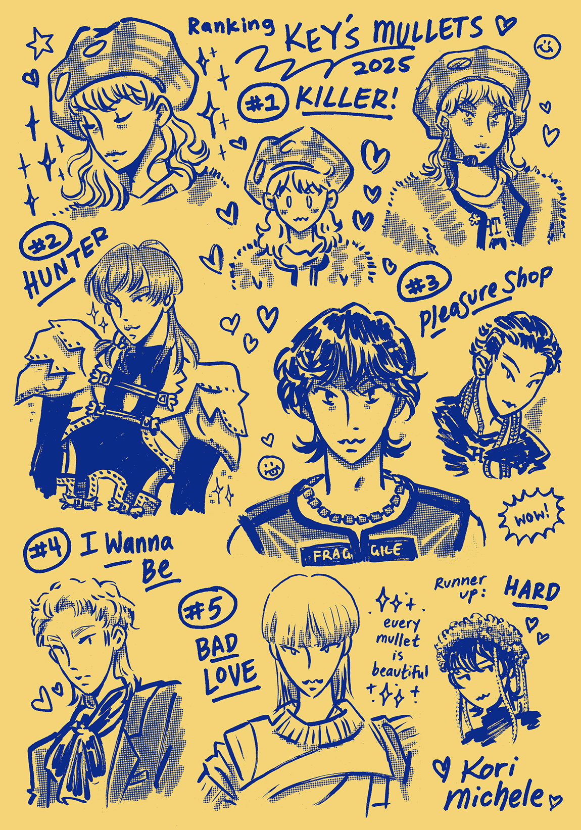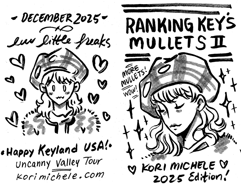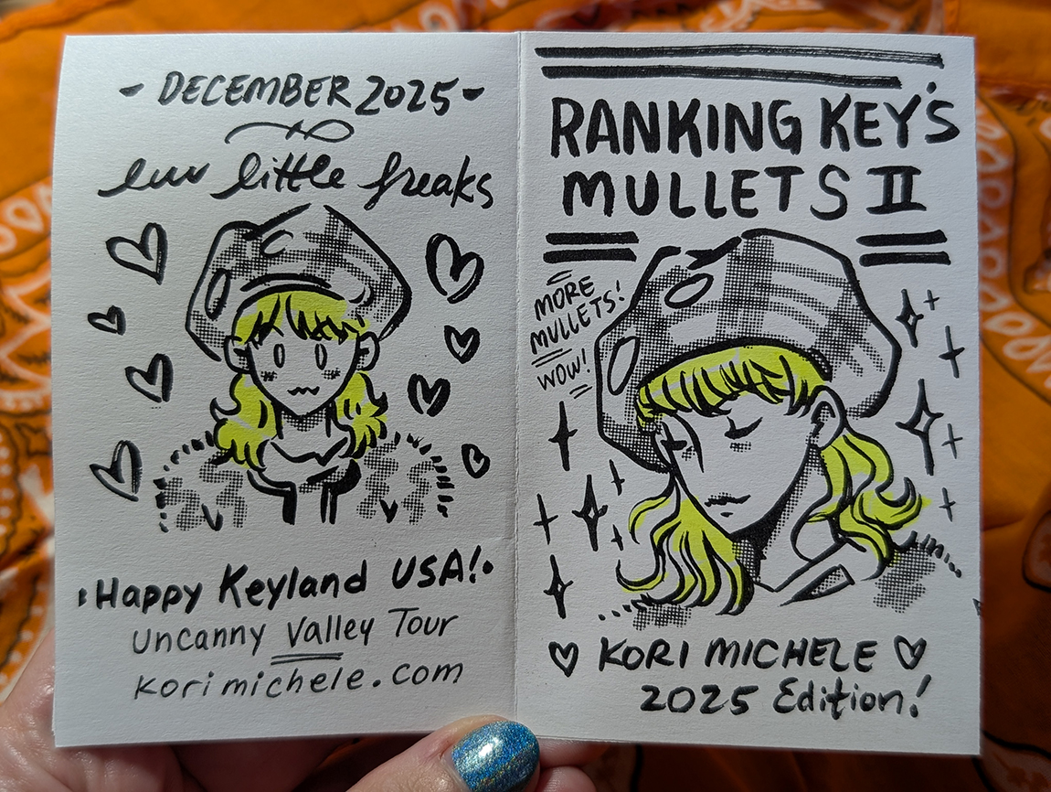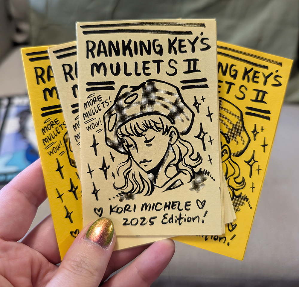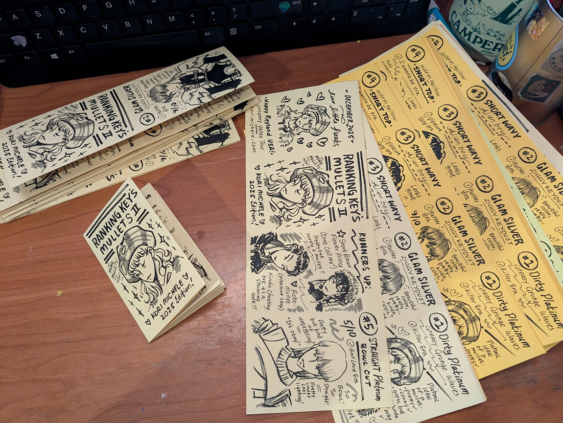Zine re-evaluating Key's best mullets in 2025. 8 page one-sheet zine, ink on paper.