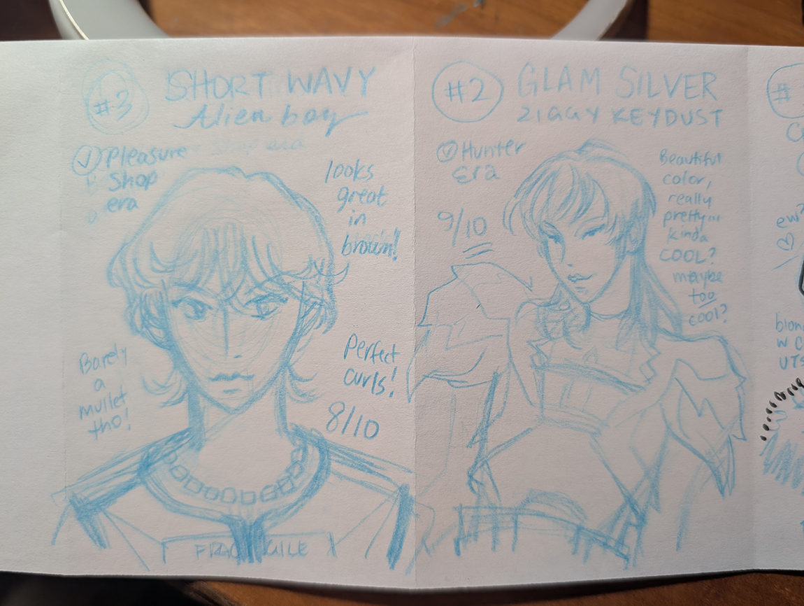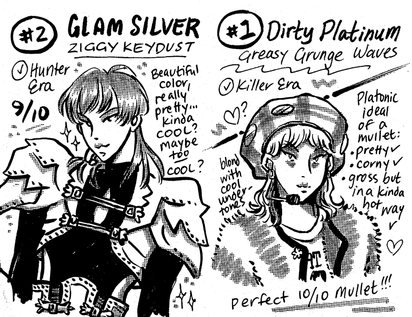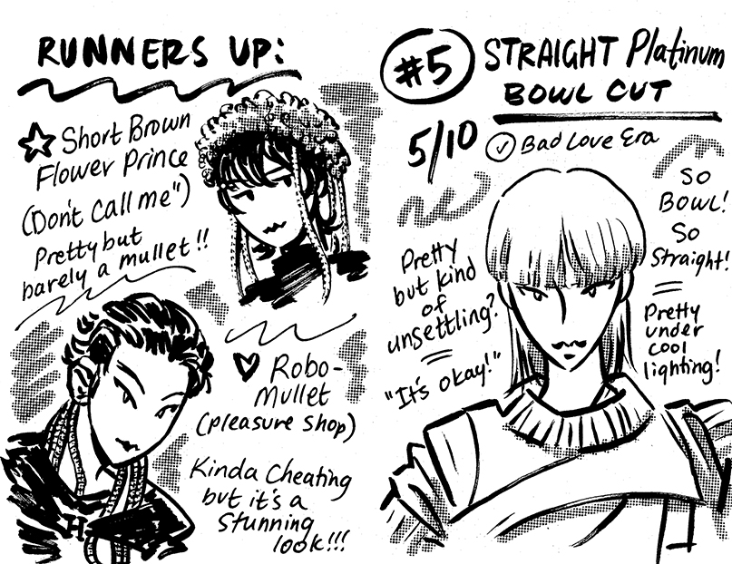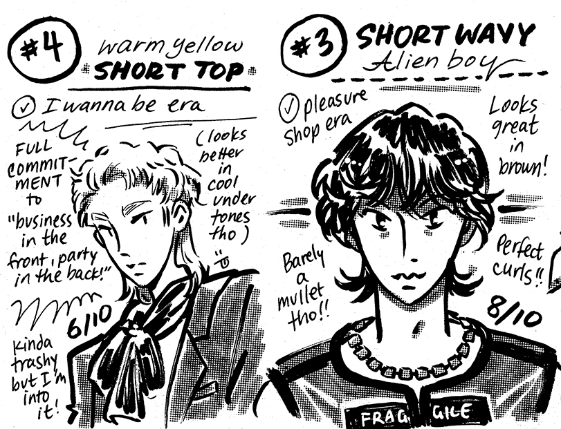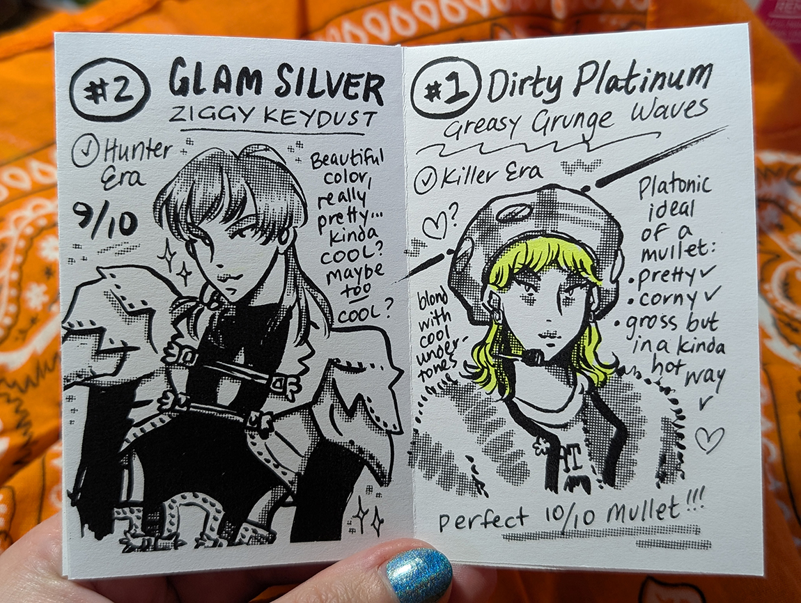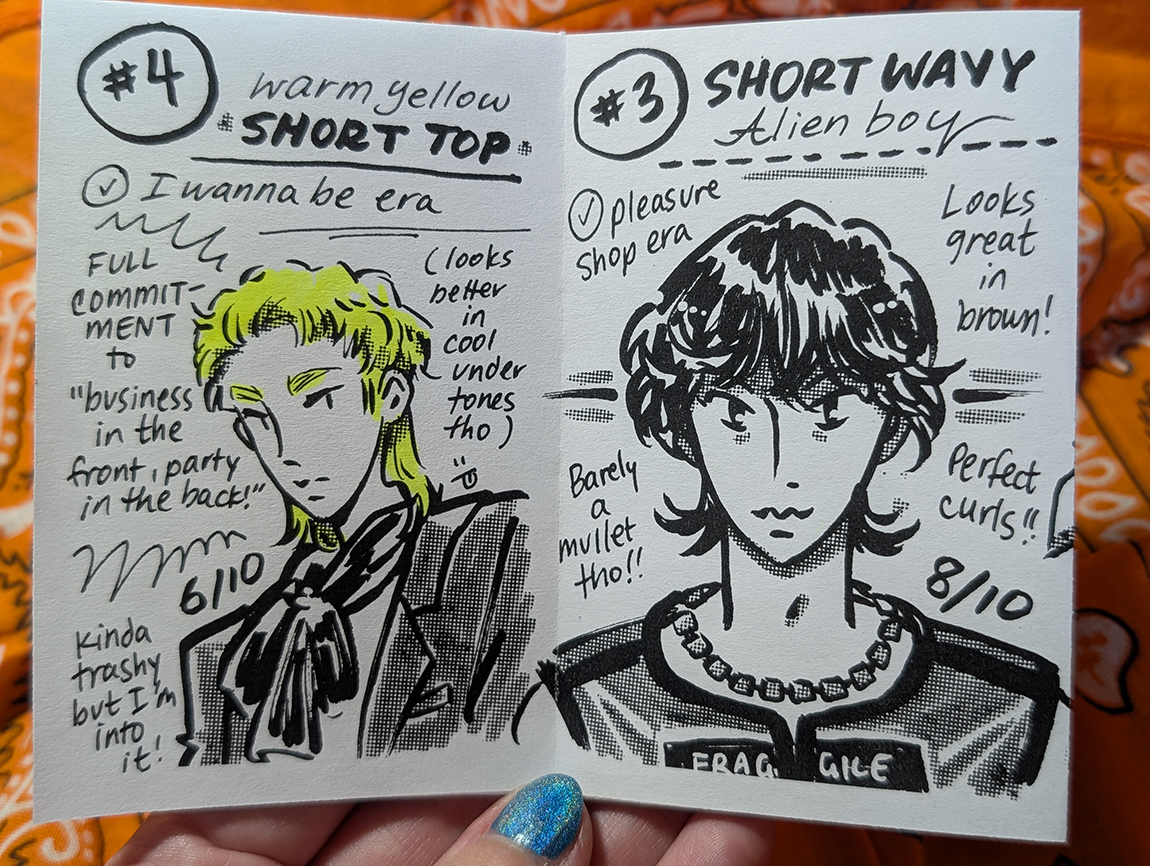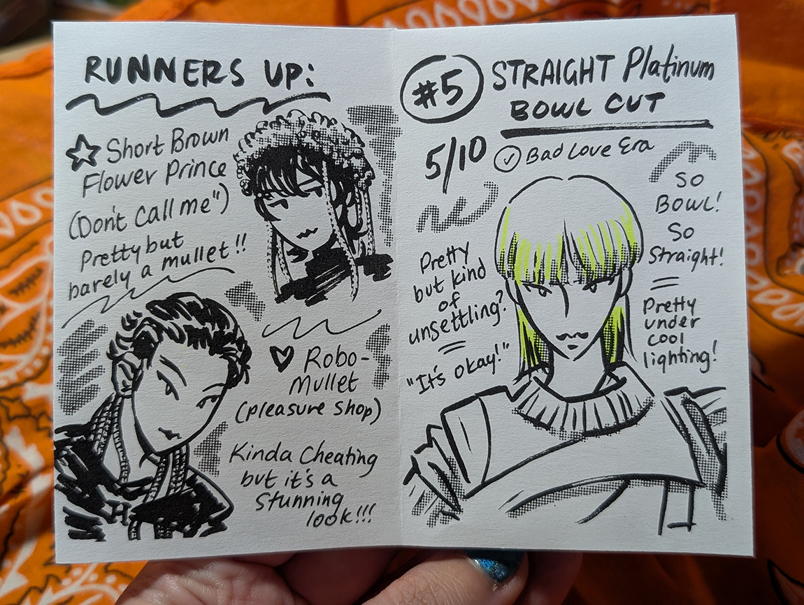Zine re-evaluating Key's best mullets in 2025. 8 page one-sheet zine, ink on paper.